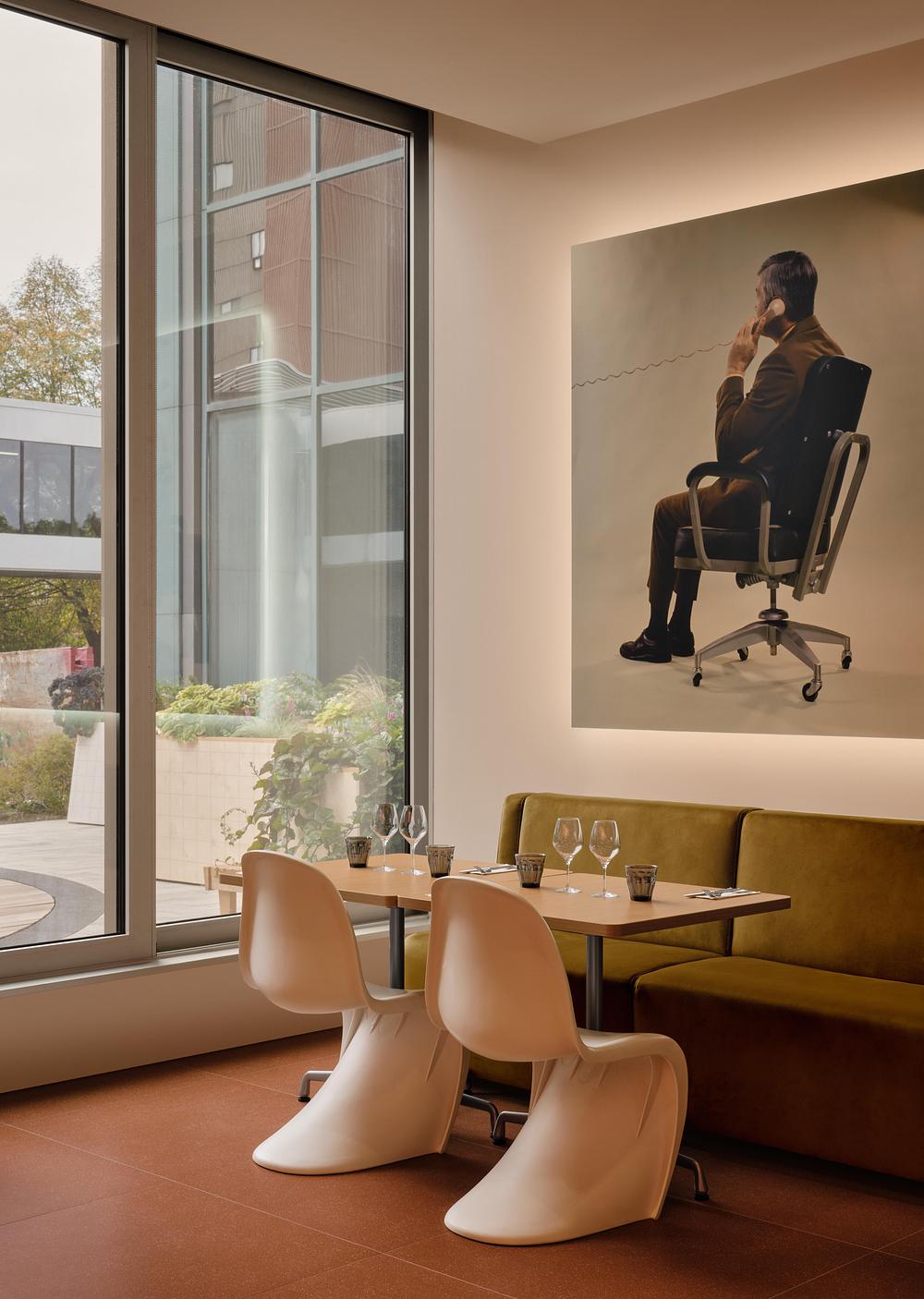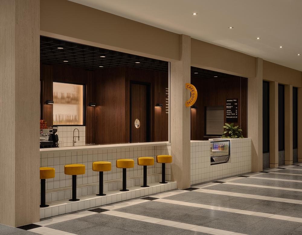 Pensé comme une extension naturelle du lobby postmoderne, le projet revisite la rigueur formelle et la rationalité propres à cette époque pour les traduire en une expérience contemporaine, chaleureuse et conviviale. À la croisée du café, du bistro et de l’espace de sociabilité, le lieu s’ancre dans son contexte tertiaire tout en proposant une nouvelle culture des usages au sein du milieu de travail.