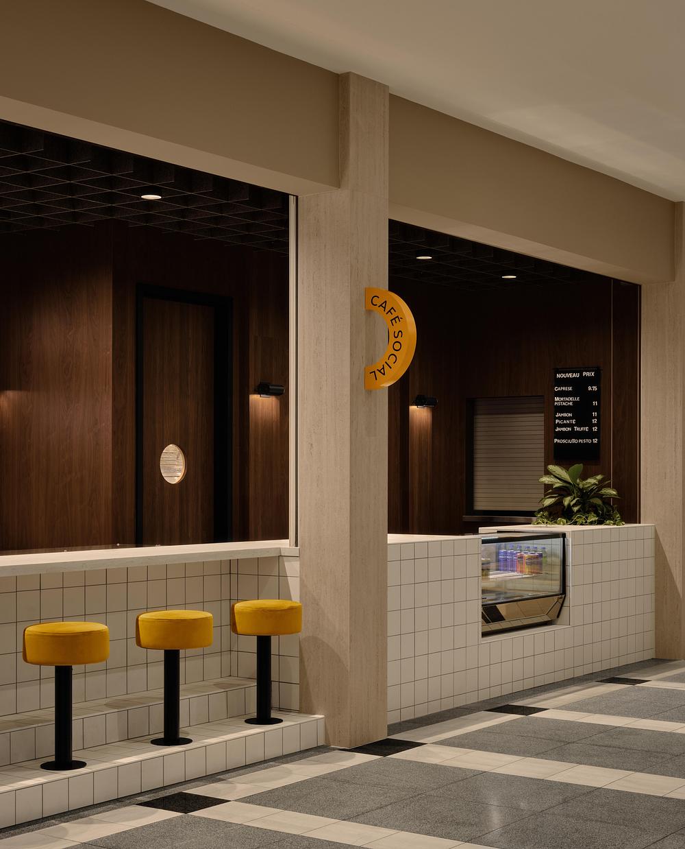 Déployé sur une superficie d’environ 2 300 pi², l’aménagement s’organise autour de deux univers distincts et complémentaires. Le Café Social, implanté en continuité avec le corridor commun, agit comme un espace de transition vivant et accessible, animé tout au long de la journée.