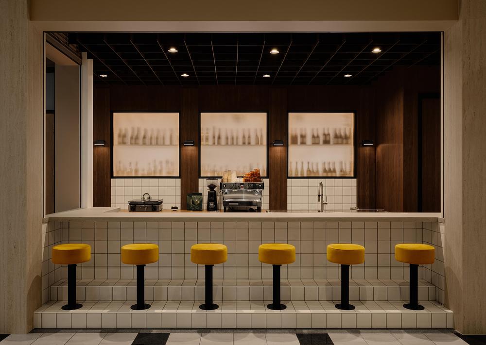Un fil conducteur matériel fort assure la cohérence du projet : une céramique blanche carrée au fini mat, utilisée autant sur les surfaces verticales que sur le mobilier intégré. Inspirée des trames du lobby existant, cette matérialité devient un motif identitaire et structurant. Un mur de noyer ponctué d’ouvertures en verre broché filtre la lumière entre le café et le bistro, créant une séparation diaphane qui maintient un dialogue visuel constant entre les espaces.