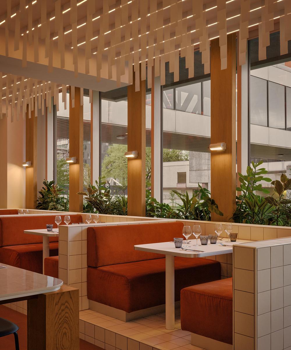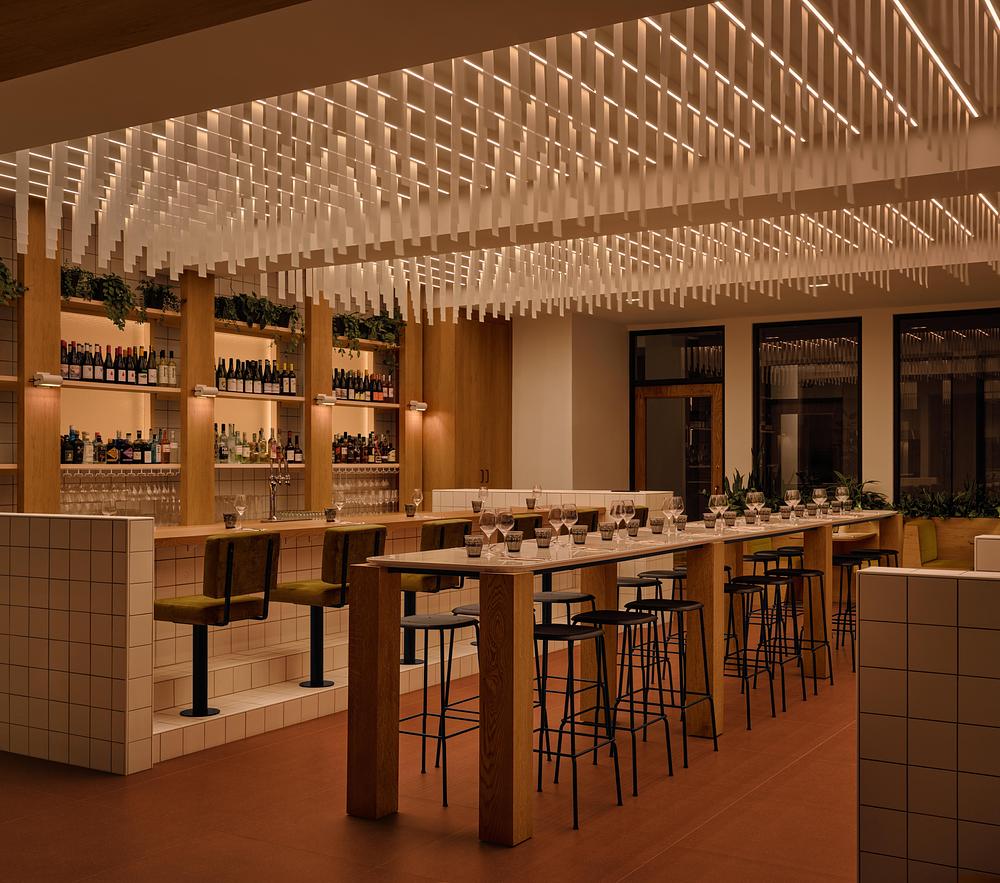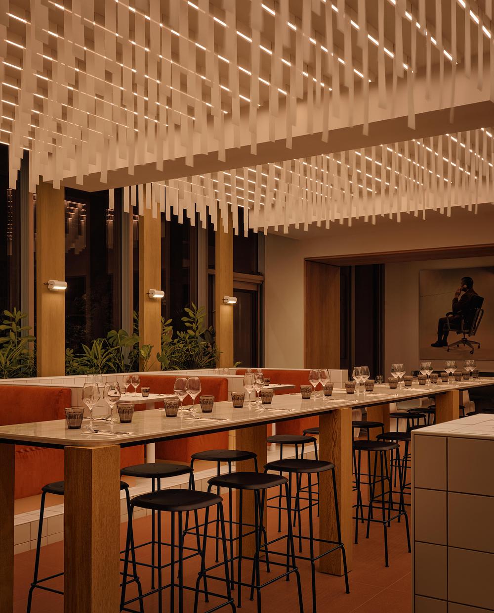 L’éclairage joue un rôle central dans l’identité du lieu, permettant une évolution de l’ambiance du matin au soir grâce à un système dim-to-warm intégré au plafond du bistro. Inspiré des stores verticaux des environnements de bureau, ce plafond suspendu introduit mouvement, rythme et profondeur, transformant une référence fonctionnelle en une expérience spatiale sensible.