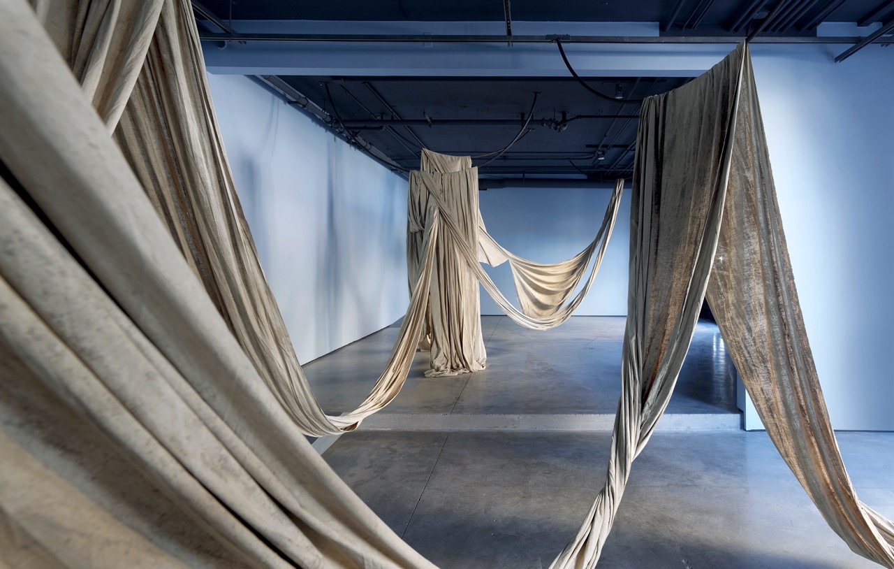 En converture : Clouds and undercurrents, Judy Watson, Vue de l’installation 2020–21. Indigo, acrylique, pigments naturels, ornements sur toile, feuilles de bunya, filets, vinyle, son.