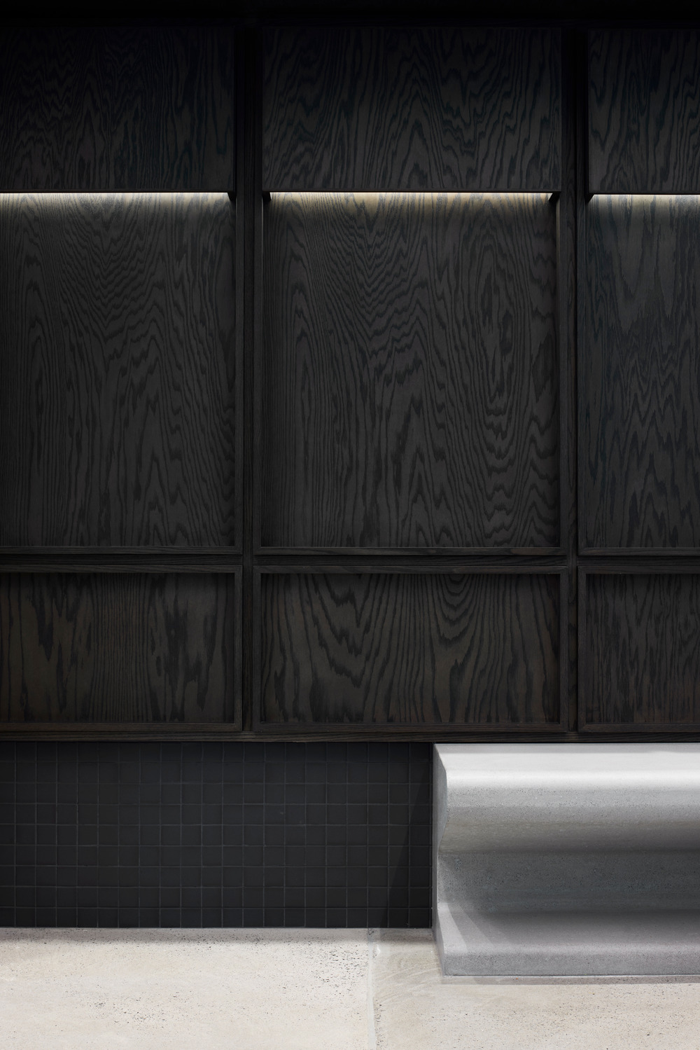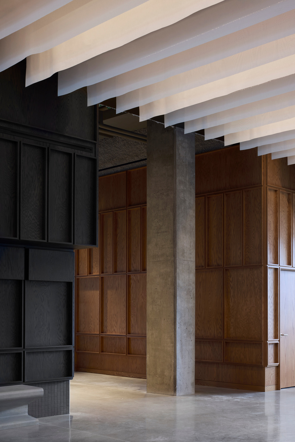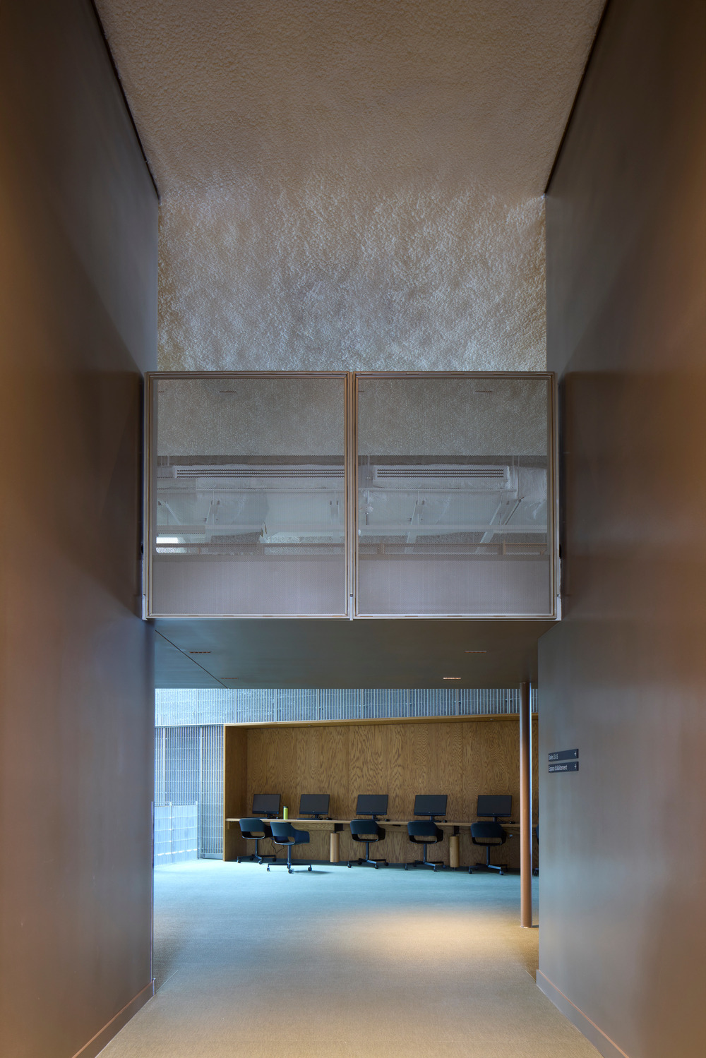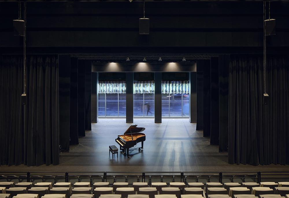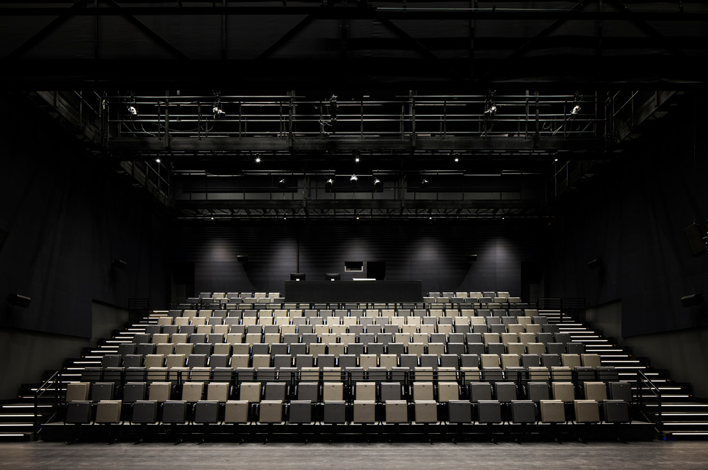 La nécessité de résoudre le décalage entre des cibles acoustiques très élevées et les grands espaces ouverts s’est avérée être un moteur important de la stratégie matérielle. L’utilisation extensive de cellulose giclée, directement exposée sur les plafonds, ou protégée par les caillebotis sur les murs de la salle de spectacle, a permis de limiter la réverbération et d’augmenter l’absorption à des niveaux exceptionnellement bas pour ce type d’espace.