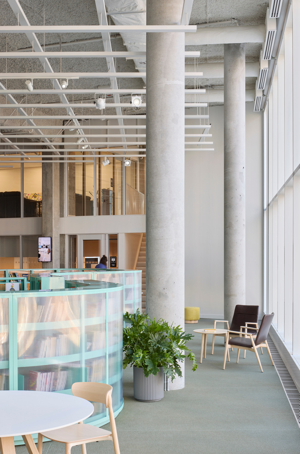 Un large escalier baigné de lumière relie cette séquence dynamique au niveau supérieur, où se déploie la bibliothèque autour d’une mezzanine centrale. Celle-ci organise les zones jeunesse, adulte, lecture et travail en sous-espaces différenciés, mais interconnectés. En façade, les aires jeunesse dialoguent avec le médialab suspendu, prolongeant l’idée d’un lieu public en constante activation.