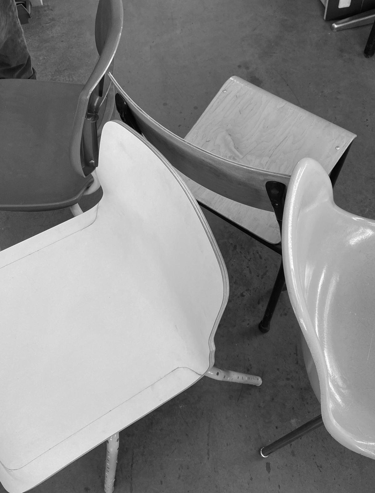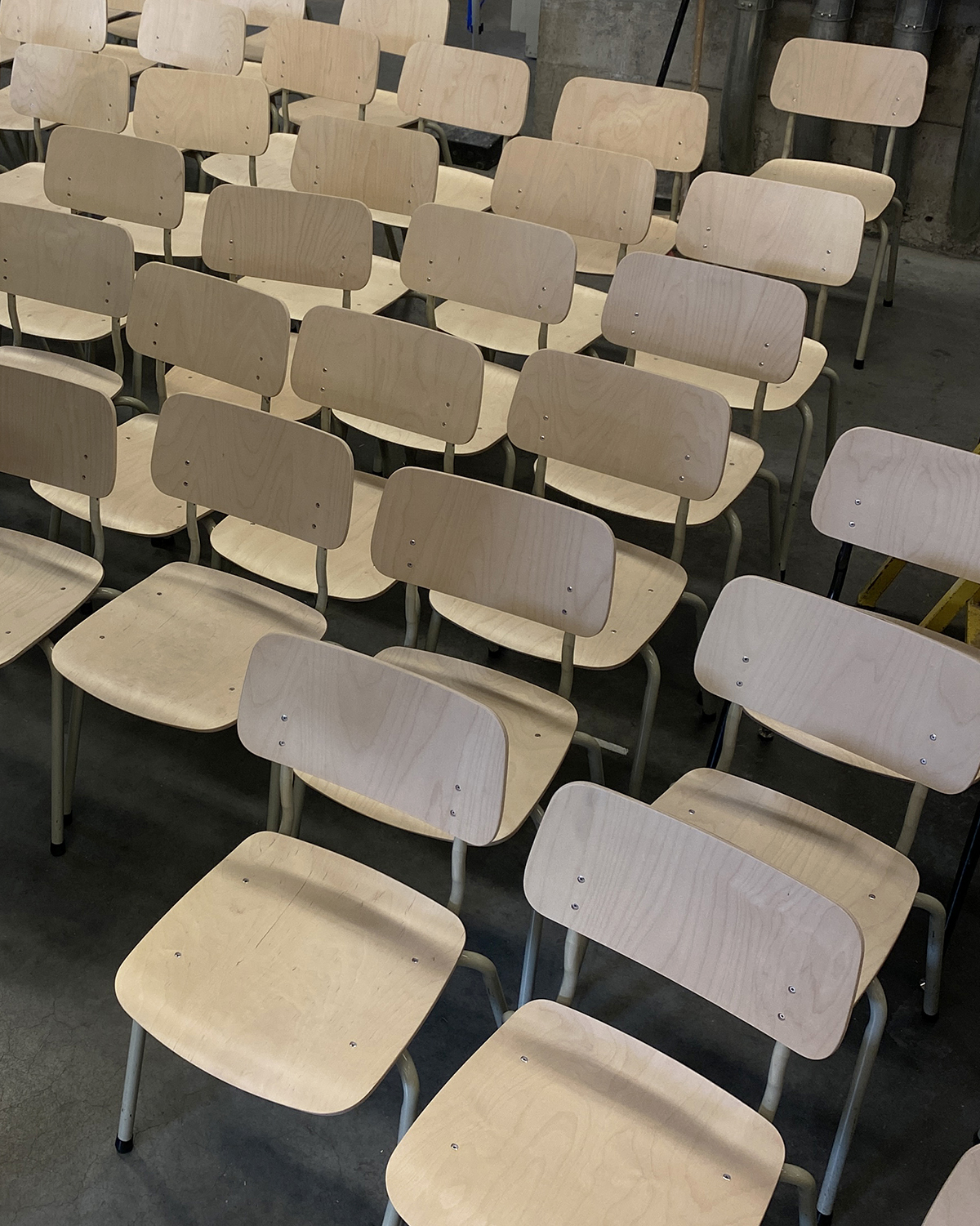 Le projet vise à revaloriser les chaises en plastique omniprésentes dans les salles de cours de l’UQAM. En conservant les structures métalliques existantes, les professeurs ont conçu une version renouvelée de la chaise scolaire, dotée d’assises et de dossiers en contreplaqué moulé. Résultat : une silhouette épurée, des courbes élégantes et une nouvelle texture en bois qui contribuent à requalifier avantageusement les espaces pédagogiques de l’UQAM.