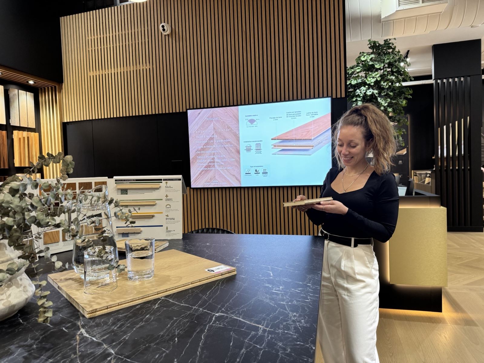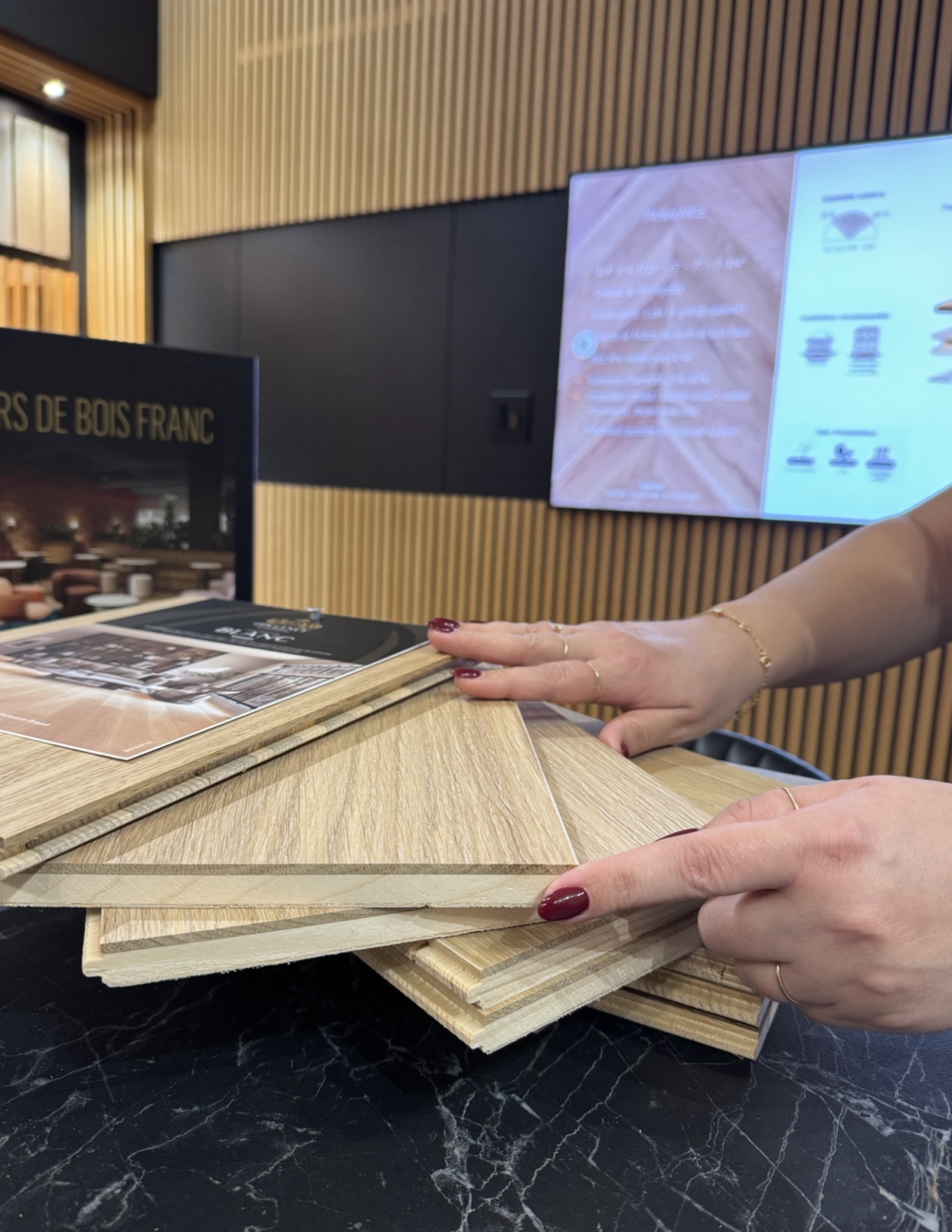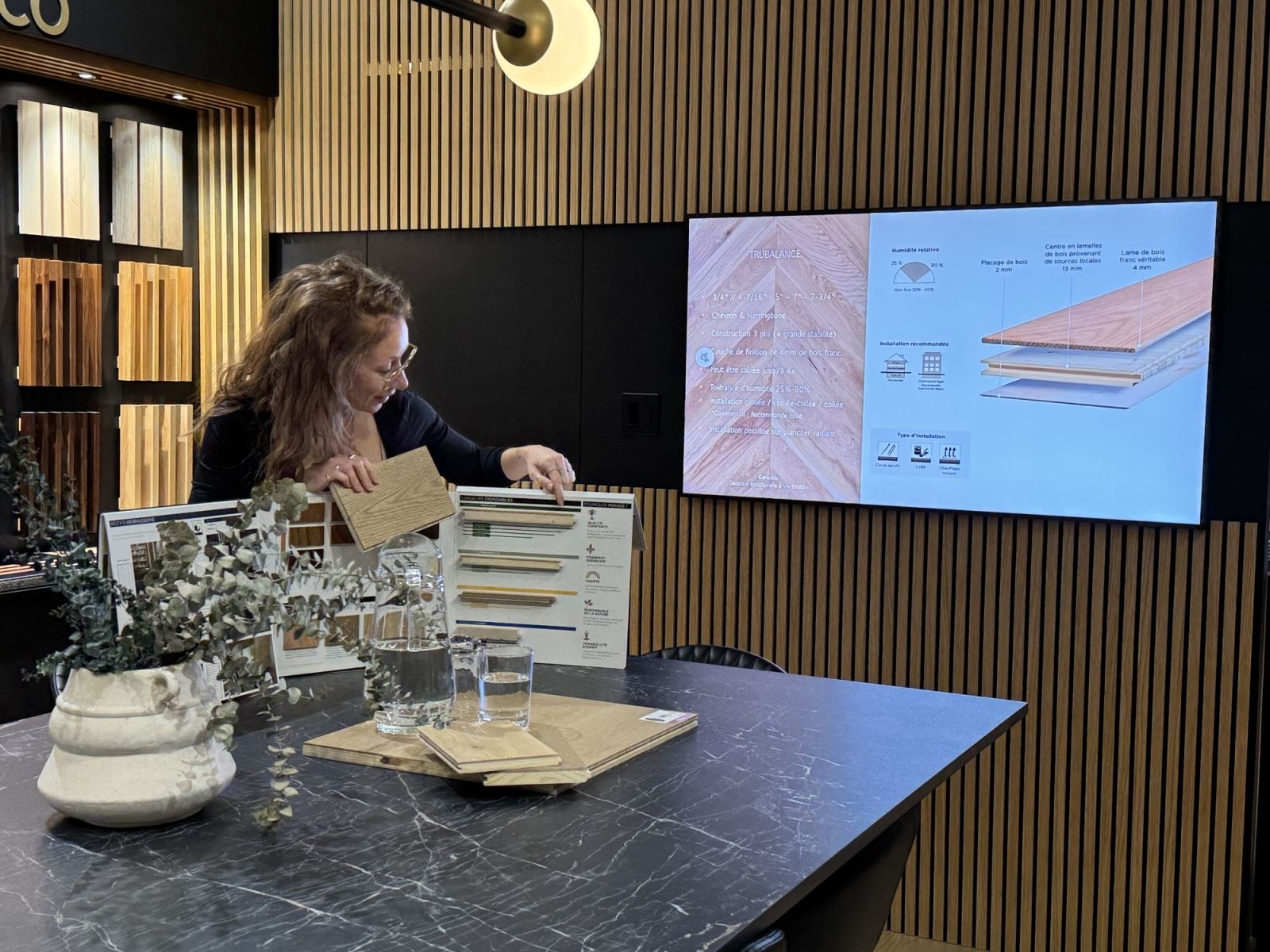 Les formateurs organisent également des Lunch and Learn directement à la Galerie MIRAGE. Ces rencontres conviviales permettent de découvrir les essences de bois, approfondir les aspects techniques et mieux comprendre les particularités des installations. Pour les firmes qui ne peuvent pas se déplacer, l’équipe de la galerie peut se rendre directement en bureau afin d’offrir la même expérience dans le confort de leur environnement de travail.