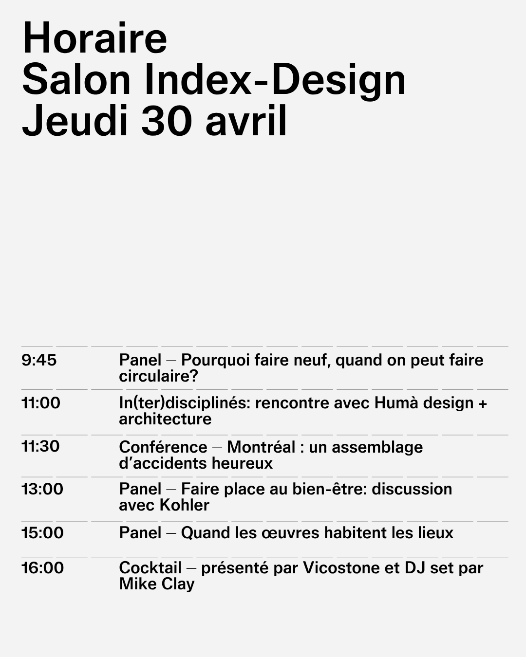 Participez également à la Journée de conférences Index-Design qui se tiendra cette année la veille du Salon, au Musée des beaux-arts de Montréal. Les détenteurs de billets de la Journée de conférences du 29 avril ont automatiquement une entrée pour le Salon le lendemain.