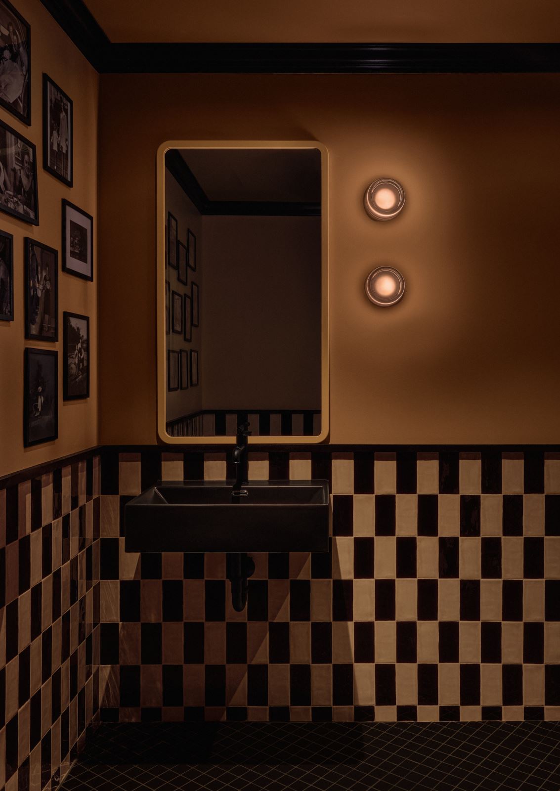 La stratégie d’éclairage dépasse la seule boîte lumineuse centrale : un mélange d’appliques murales, de lampes de table, d’œuvres d’art ludiques, de compositions florales et de souvenirs vintage inspirés de limousines anciennes crée une ambiance chaleureuse, tactile et habitée. Les salles de bain reprennent cette palette visuelle, avec des carreaux à damier crème et noir lustré, ponctués de photos de famille vintage des propriétaires, ajoutant une touche personnelle et intime.