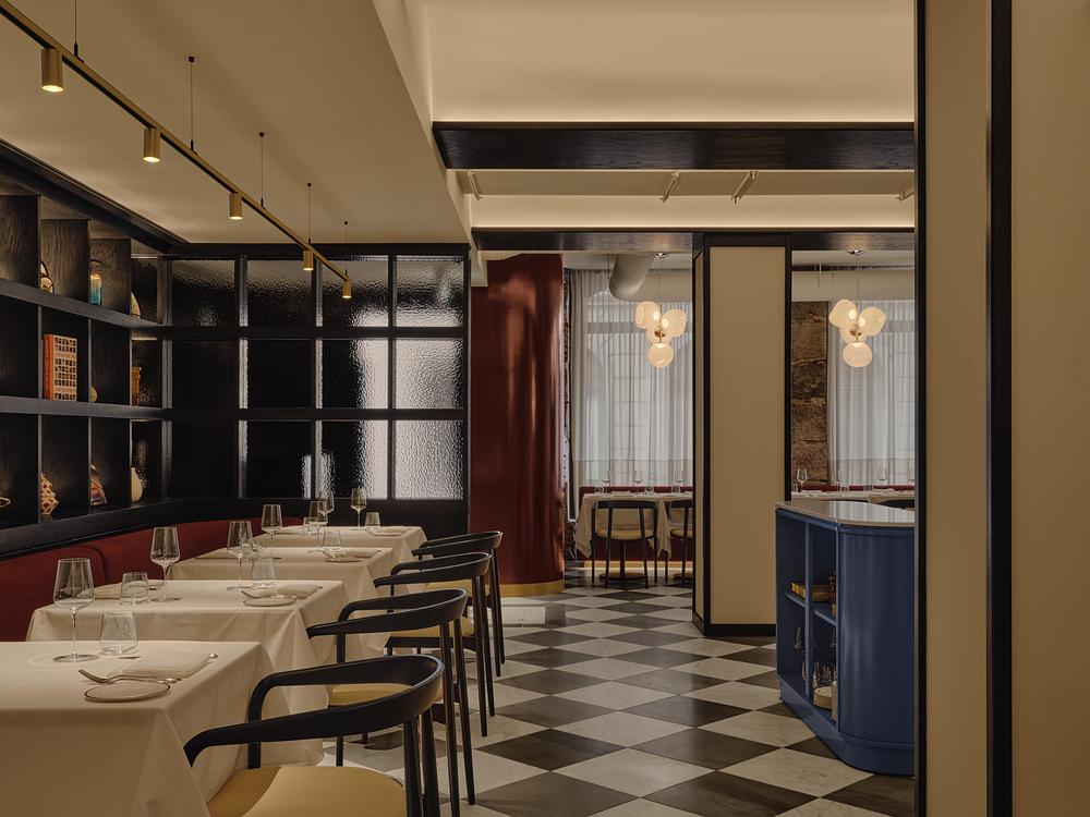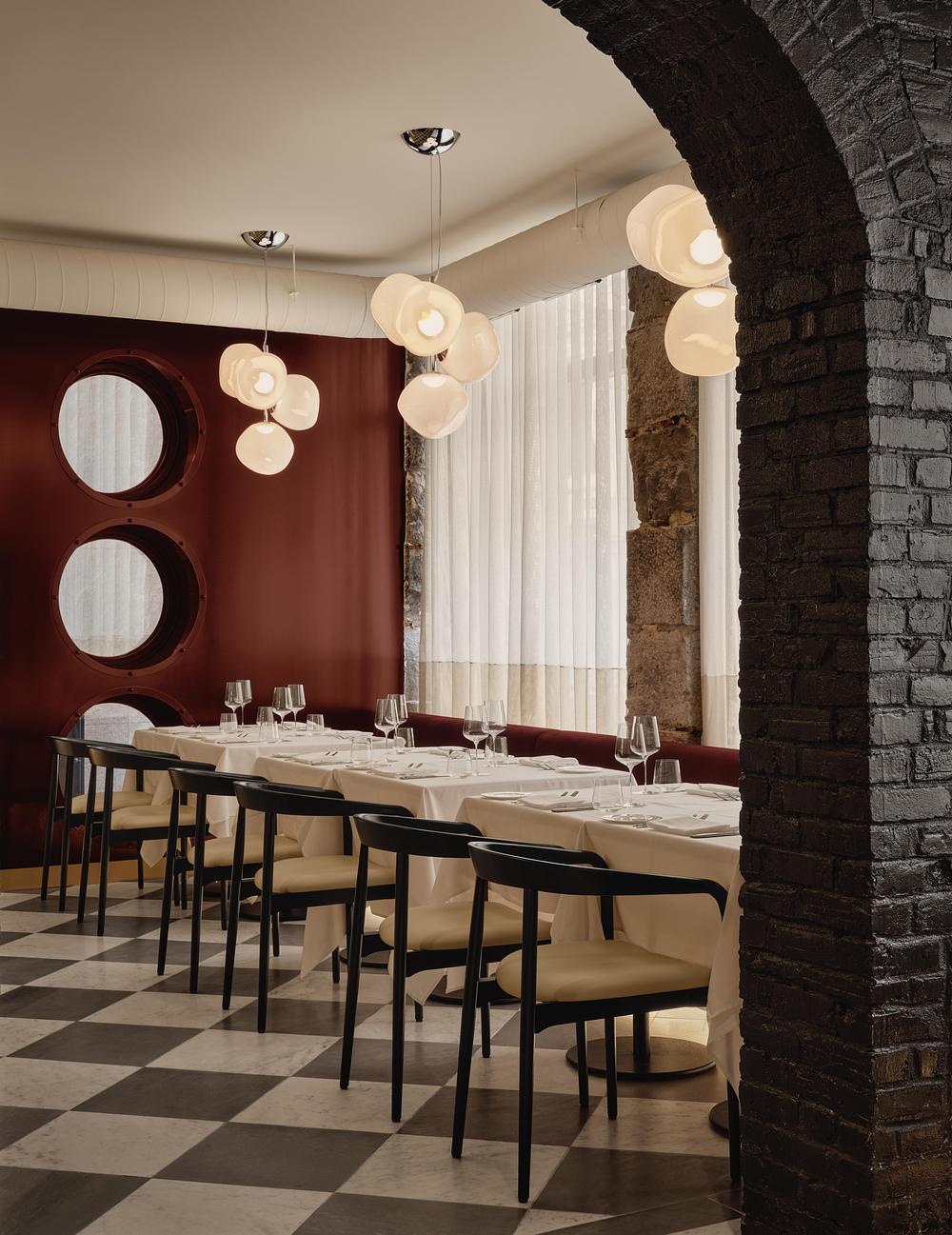 La salle à manger principale se distingue par ses plafonds plus élevés, voûtés et rythmés, qui amplifient la lumière et donnent du souffle à l’espace, structurant ainsi l’ambiance singulière du lieu. Au sol, le damier de marbre déploie un ancrage graphique fort et rend hommage à l’héritage italien. Les jeux de textures de briques et de porcelaines rappellent la simplicité brute des matériaux du littoral, tandis que les formes arrondies de la retombée et du mur de l’entrée offrent un clin d’œil à la pêche portuaire, autant par leur forme que par leur couleur, dans un fin rappel des coques de bateaux.