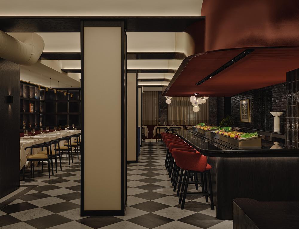 Mare s’organise autour de deux zones distinctes, chacune invitant à vivre les rituels de la gastronomie italienne. Sous la grande retombée, le bar à cocktails accueille les convives dans une atmosphère intime, douce et chaleureuse, et offre un aperçu sur un impressionnant cellier. On y retrouve également une grande table ronde en marbre noir, installée en retrait pour offrir une parenthèse exclusive aux groupes, ainsi que le bar à crudo, pièce maîtresse de l’expérience.
