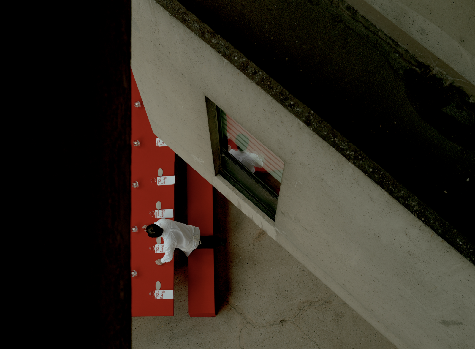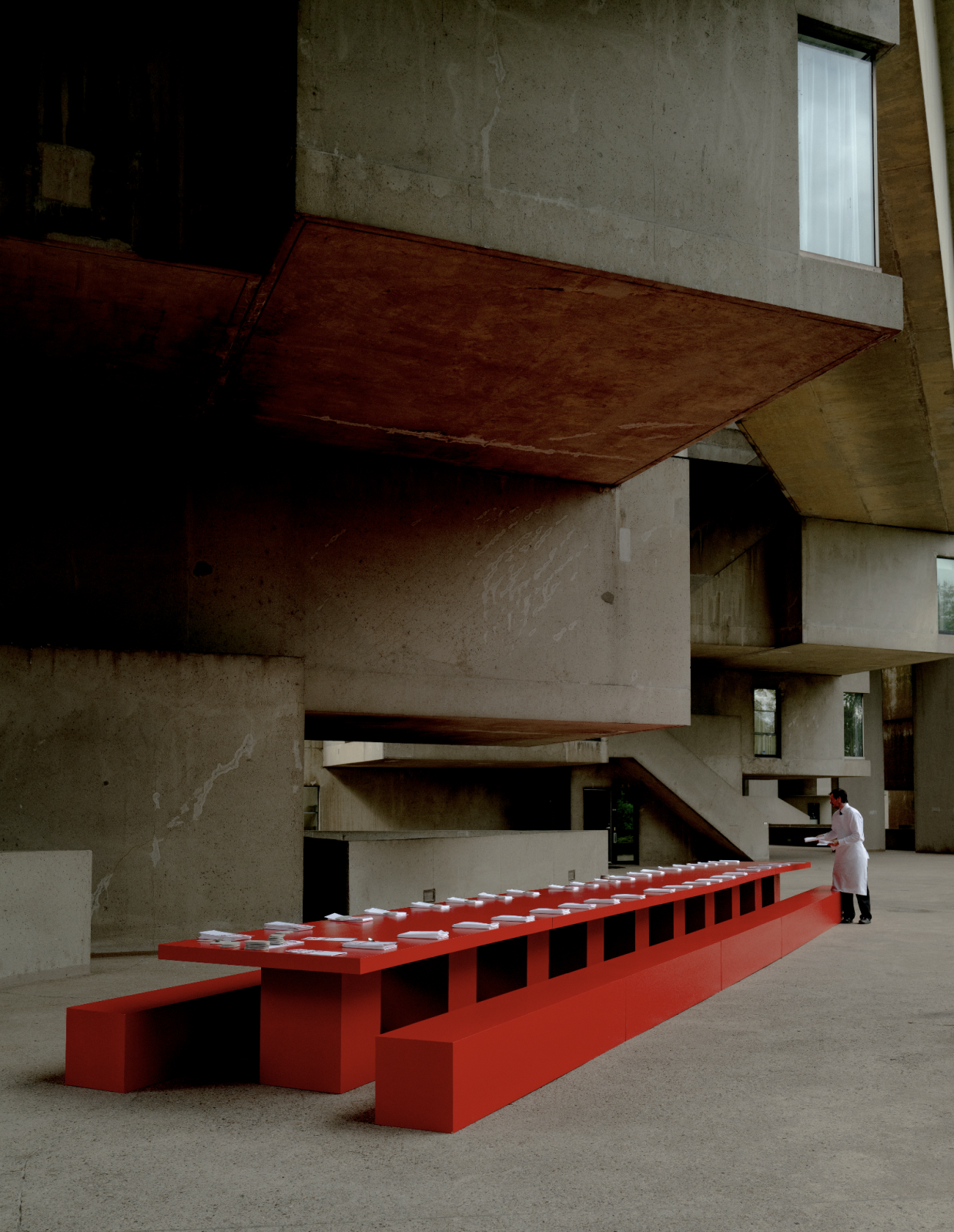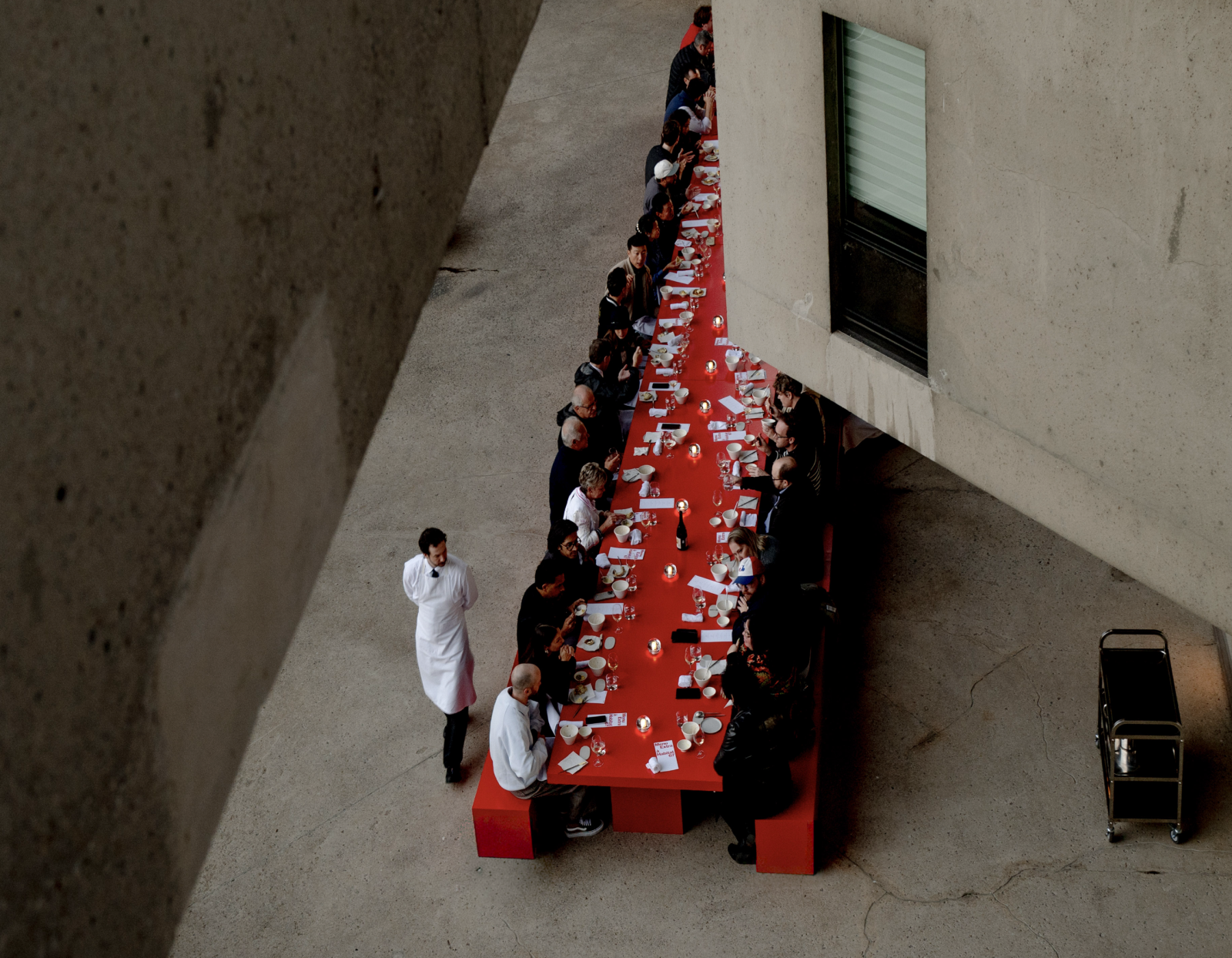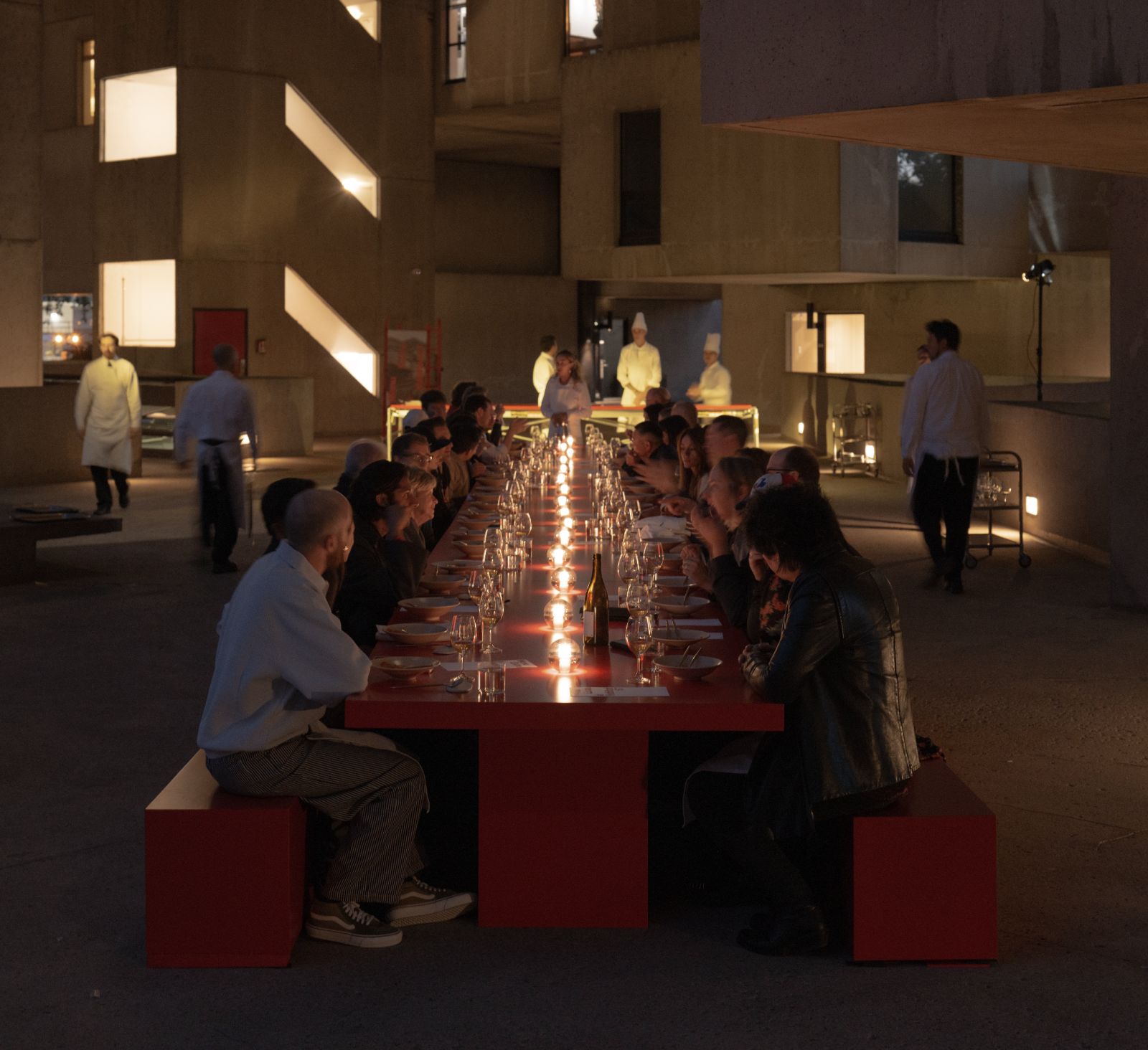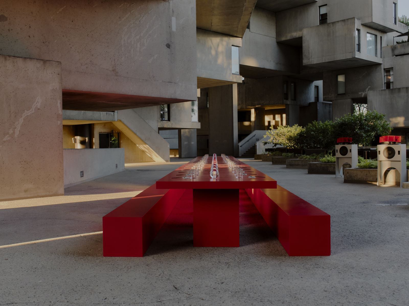 Dressée au coeur du parcours, une série de blocs monolithiques composait une table conçue sur mesure par Menu Extra et réalisée par Modulor. Parée d’un rouge Expo 67, elle s’étirait sur plus de douze mètres pour venir prolonger le language architectural du lieu et nourrir les échanges.