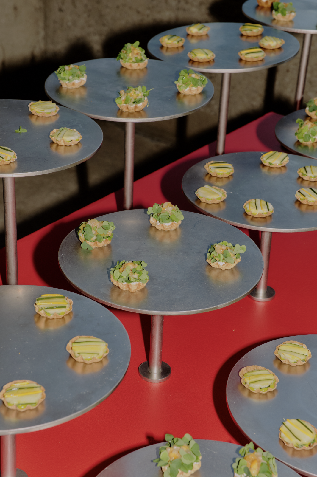 De là, elles étaient conduites vers une installation de canapés, posés sur un module rouge surmonté d’assiettes en acier brossé. Ce premier arrêt proposait une série d’amuse-bouches, tels qu’une tartelette de courgette et une huître à la tige de coriandre.