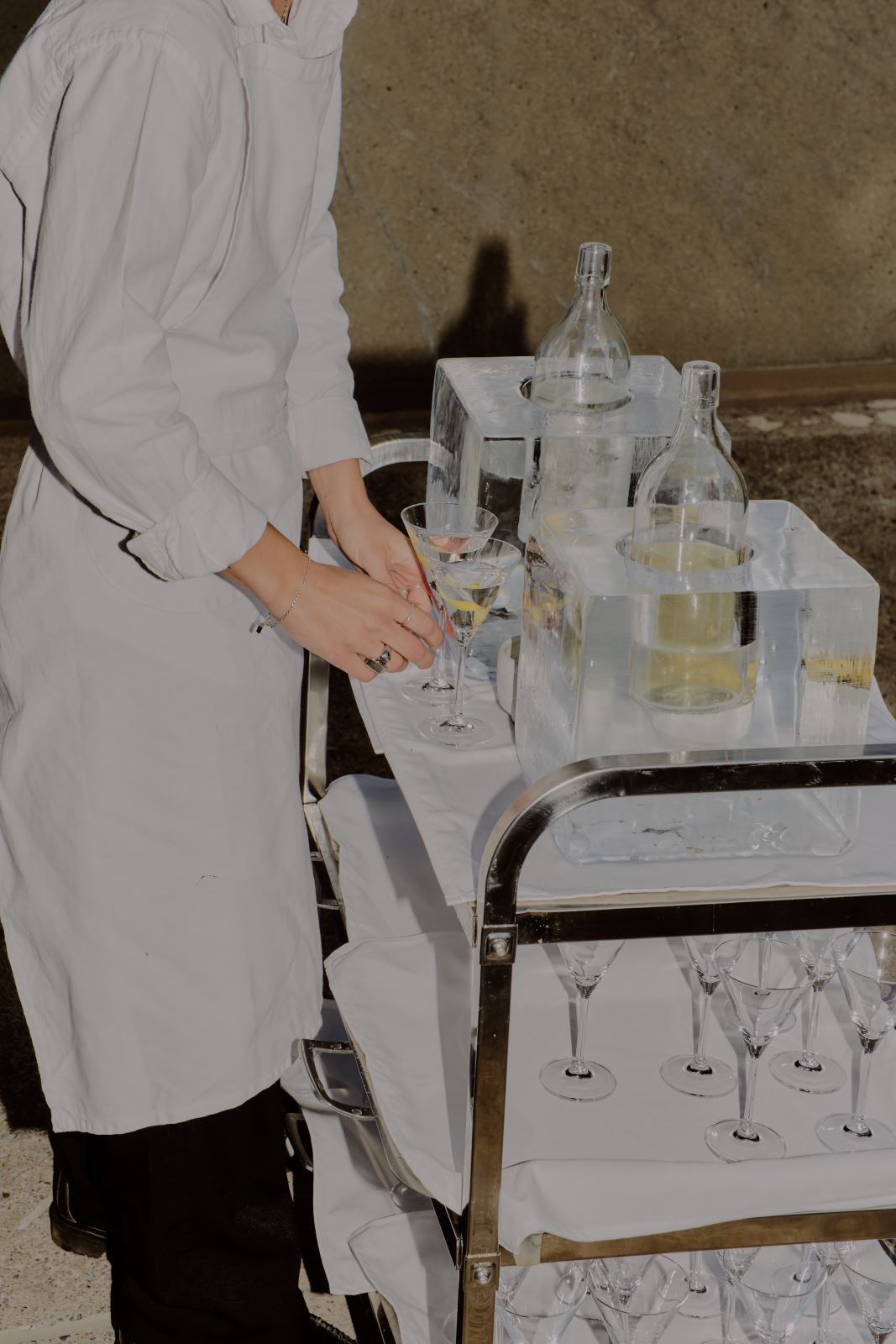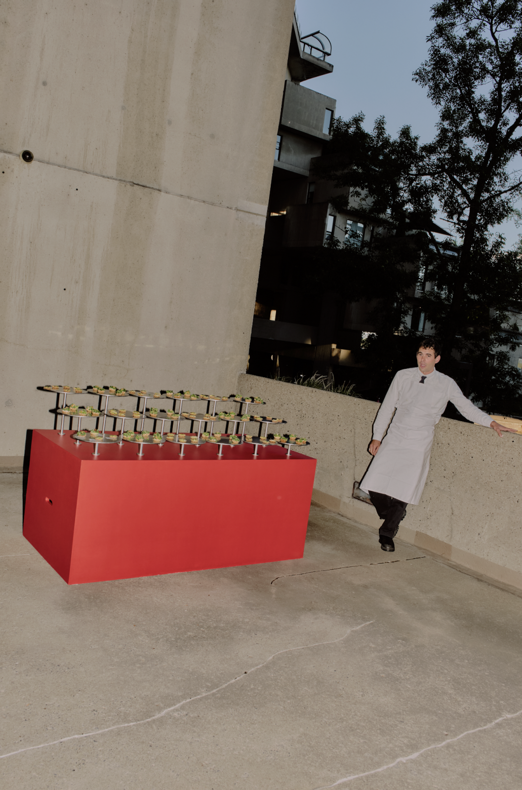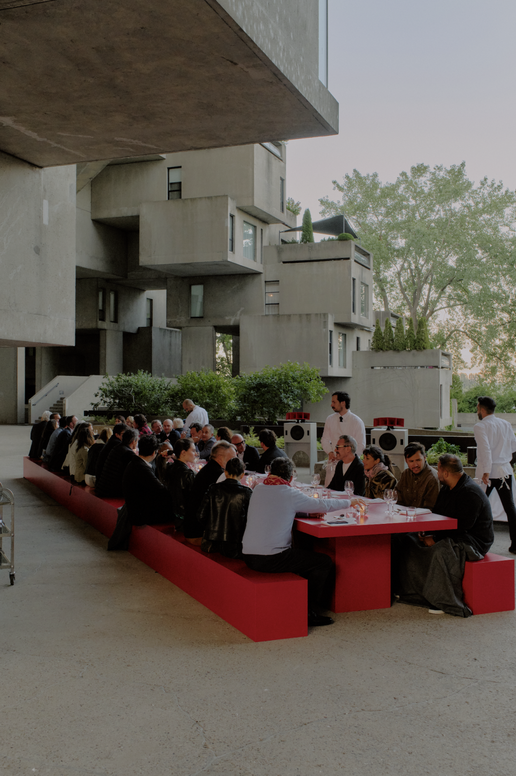 Au-delà de l’assiette, Menu Extra a imaginé une mise en scène où chaque geste d’hospitalité s’inscrit dans un rapport de proximité à l’espace. Les convives étaient d'abord accueillies par un service de martinis au guéridon, sur lequel reposaient de grands blocs de glace sculptés à l’image des cubes d’Habitat 67. Elles étaient ainsi invitées à entrer dans l’univers monumental du site, où le froid de la glace dialoguait avec le béton brut des façades.