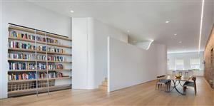 Du mobilier intégré distribué à travers la maison vient cadrer et définir les pièces. L'ébénisterie réalisée par Kastella compose la ligne directrice dans l'espace et participe à créer les différentes ambiances.