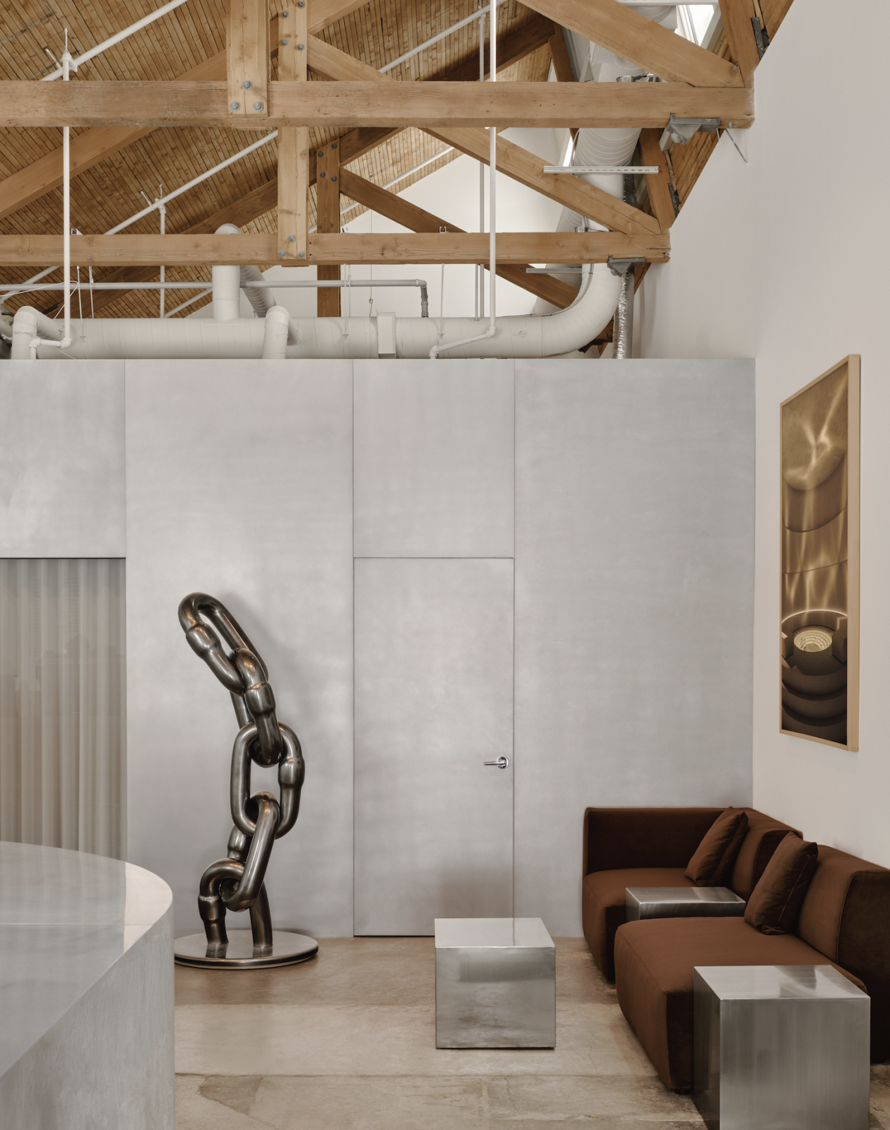 Au cœur du plan, un volume en métal brossé abrite bureaux et espaces servants, rappelant l’héritage industriel du site. Des puits de lumière éclairent la structure de bois d’origine appuyée sur le béton brut et le mobilier sur mesure signé Raymond Raymond.