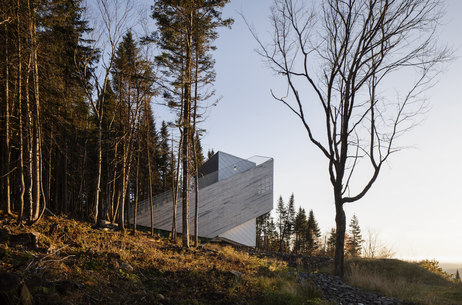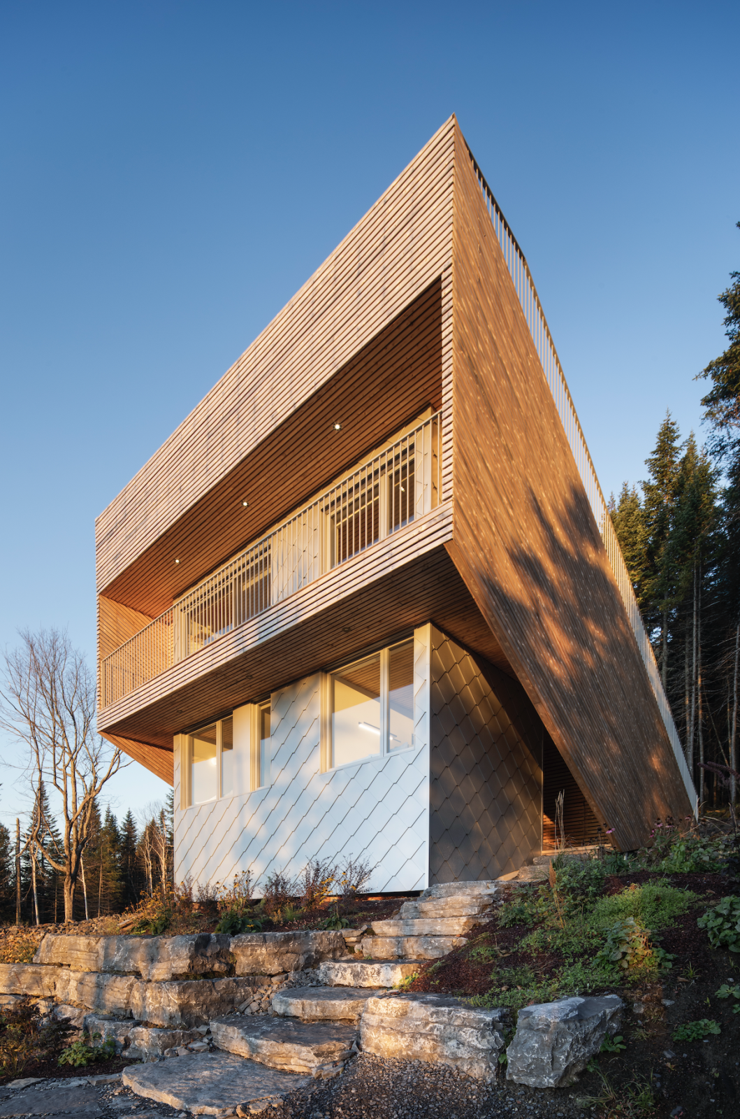 Parfait pour les amoureux de plein air, le projet se compose de deux volumes complémentaires : un volume métallique, recouvert de tuiles estriennes, qui abrite les espaces intérieurs ainsi qu’une terrasse avec spa, et un grand gradin en bois orienté vers le sud-est, offrant des vues panoramiques.