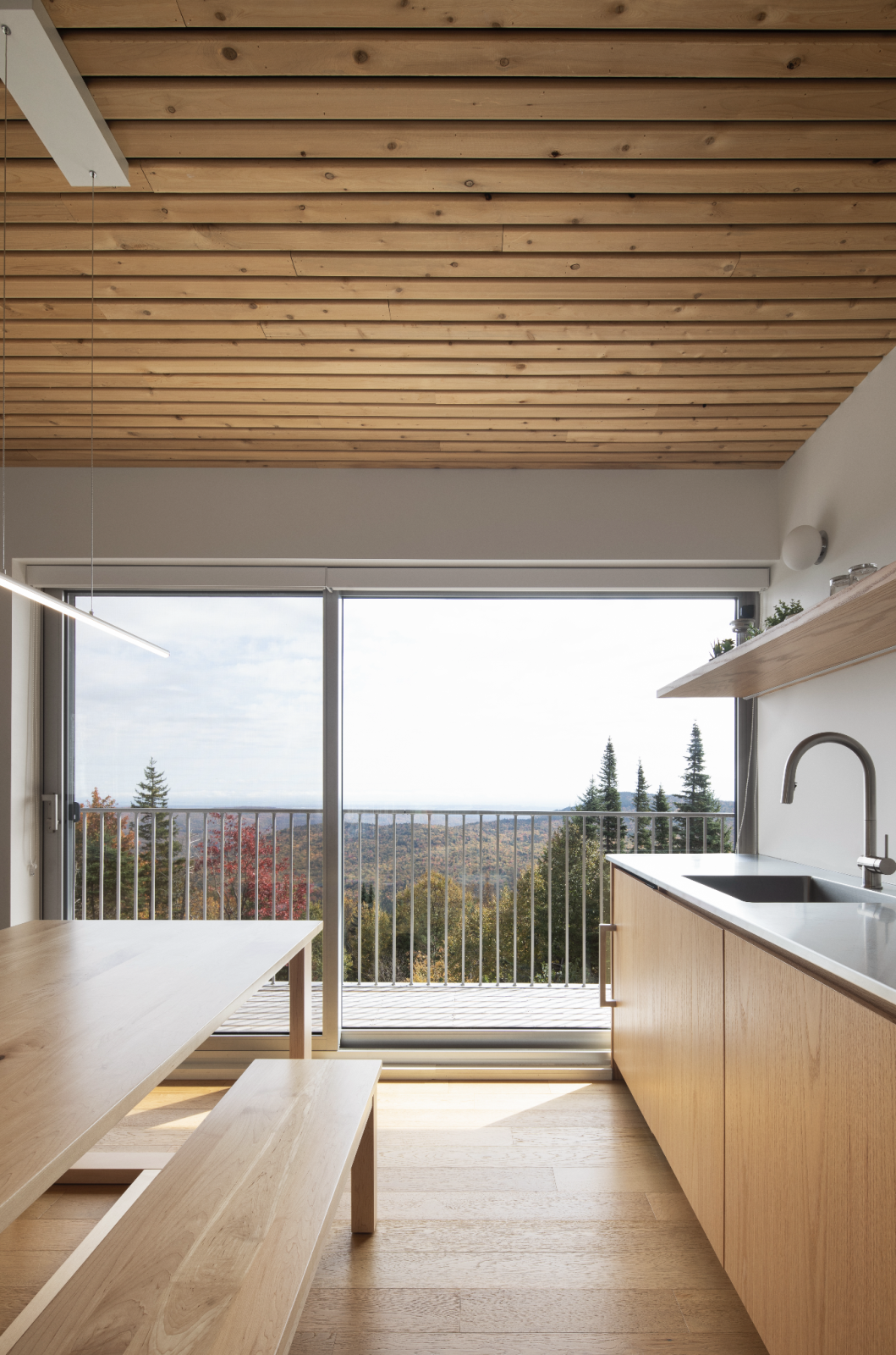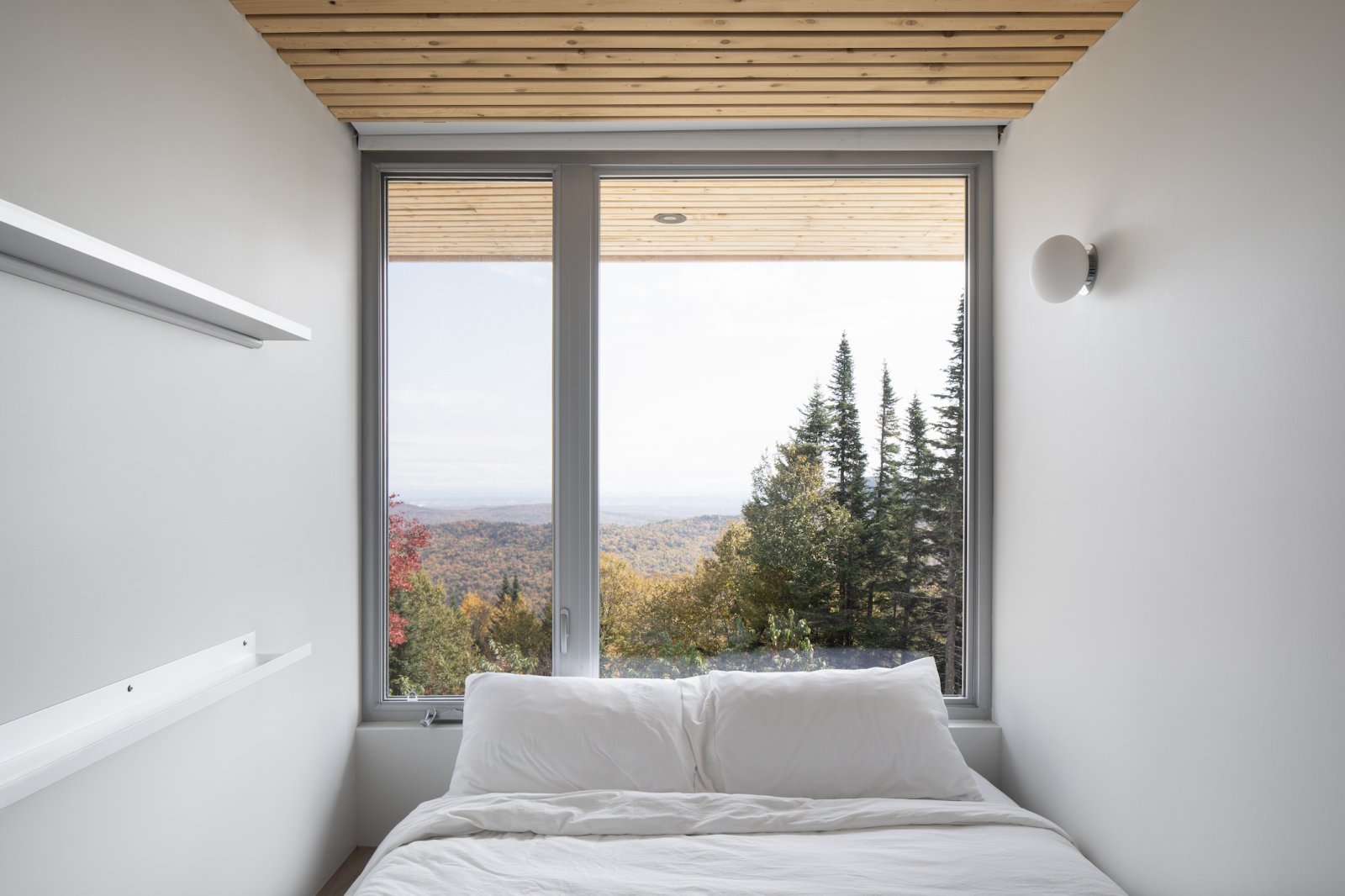 Au rez-de-chaussée se trouvent les chambres séparées par une salle de bain. À l’étage, les espaces de vie à aire ouverte, accessibles par une échelle ou par les gradins, offrent de splendides vues sur la forêt et le paysage environnant.