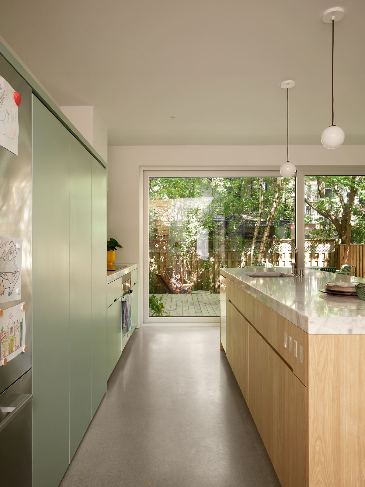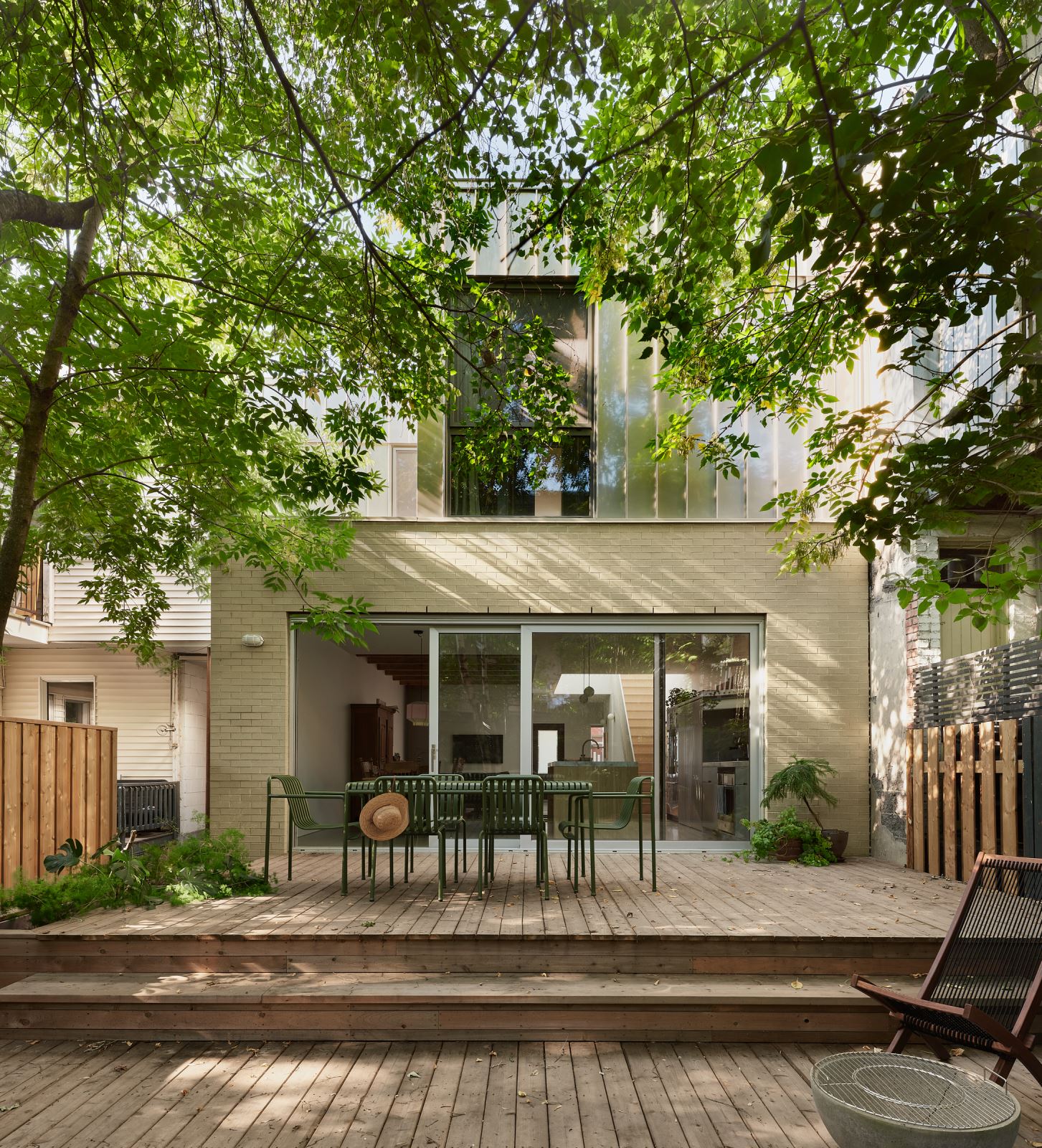 L’espace de vie s’ouvre largement sur la cour arrière grâce à une grande baie vitrée, où une terrasse en bois permet de prolonger l’habitation vers l’extérieur. La végétation, omniprésente dans le projet — que ce soit dans le jardin, les pots, ou encadrée par les fenêtres — agit comme un contrepoint vivant à la rigueur des lignes architecturales.