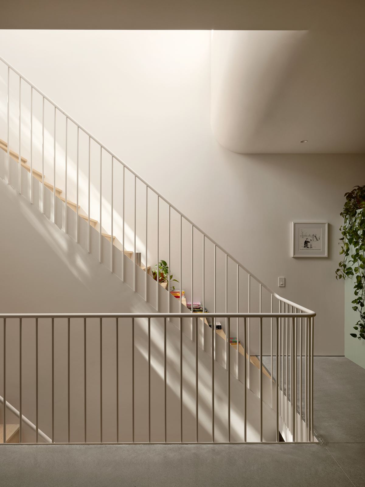 Les matériaux intérieurs — bois, béton poli, murs blancs — créent une atmosphère apaisante, ponctuée de touches végétales et de couleurs discrètes. L’utilisation de matériaux naturels, pâles et texturés contribue à créer une atmosphère de campagne discrète, où l’on sent la lumière filtrer doucement, les plantes prendre place, et les objets personnels animer les lieux. La séquence spatiale s’organise autour de cet escalier, qui agit comme colonne vertébrale du projet, reliant les espaces de jour au rez-de-chaussée aux chambres à l’étage.
