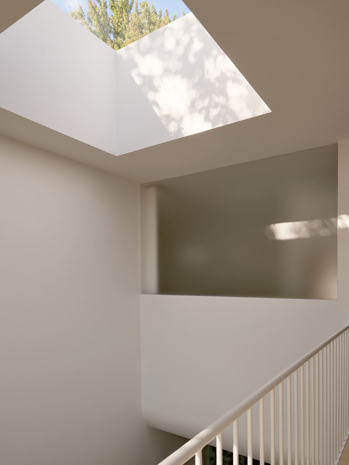 L’intervention cherche à maximiser l’apport de lumière naturelle et la fluidité des parcours, malgré modestie de la surface disponible et de l’orientation solaire défavorable. Dès l’entrée, un puits de lumière généreux surplombe un escalier central aux lignes claires, inondant le cœur de la maison d’une lumière douce et changeante au fil de la journée. La verticalité de l’entrée et contrebalancé pour l’horizontalité amenée par une ouverture large sur la terrasse et jardin arrière.