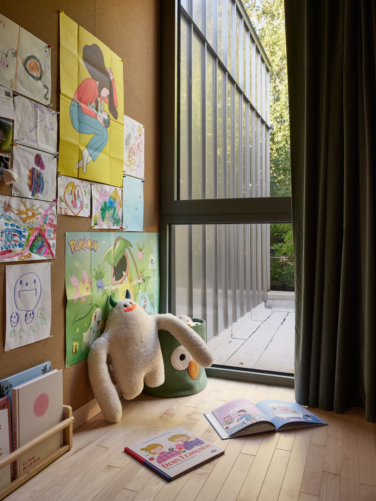 Le salon, la salle à manger et la cuisine sont réunis dans une grande pièce fluide au rez-de-chaussée, favorisant les échanges et les activités partagées. L’étage accueille les chambres, baignées de lumière. Chaque espace a été pensé pour accompagner les moments du quotidien — jouer, cuisiner, lire, contempler — dans une ambiance calme et chaleureuse.