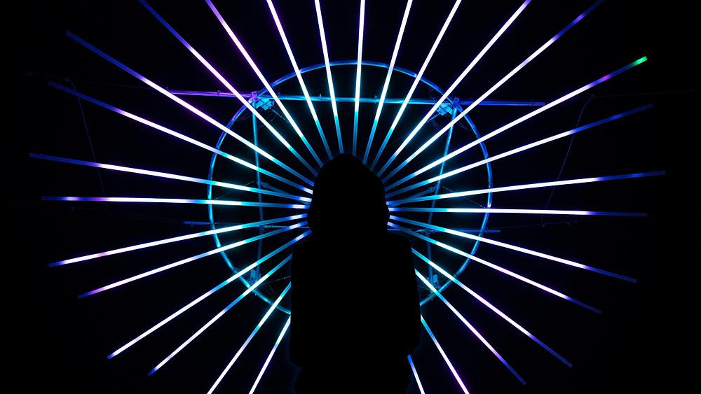 L’installation UN BRIN D’SOLEIL se compose de 32 « rayons » en aluminium et acrylique, installés sur un cadre rigide, fixé sur deux câbles de suspension. Chaque tube est équipé d’une bande LED digitale entièrement réglable pixel par pixel, offrant ainsi une grande latitude de contrôle lumineux, ce qui ouvre un vaste éventail de possibilités d’animations et de compositions visuelles.